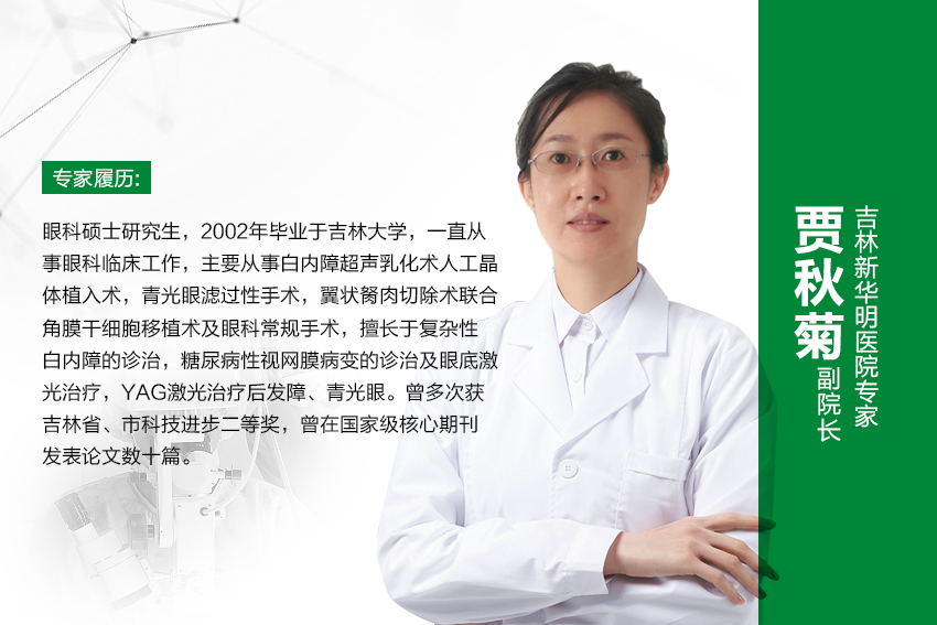 简介:眼科硕士研究生,2002年毕业于吉林大学,一直从事眼科临床工作,主要从事白内障超声乳化术人工晶体植入术,青光眼滤过性手术,翼状胬肉切除术联合角膜干细胞移植术及眼科常规手术,擅长于复杂性白内障的诊治,糖尿病性视网膜病变的诊治及眼底激光治疗,YAG激光治疗后发障、青光眼。曾多次获吉林省、市科技进步二等奖,曾在国家级核心期刊发表论文数十篇。